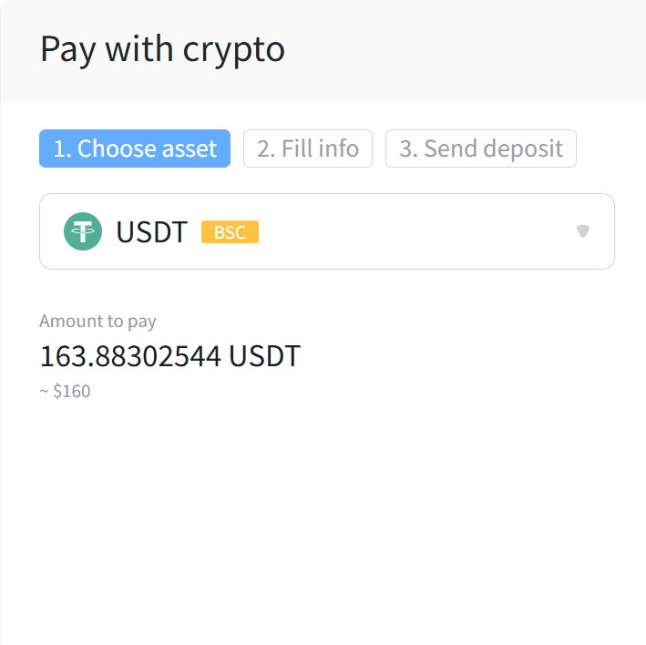 - Select the cryptocurrency you want to pay with (e.g. USDT).
