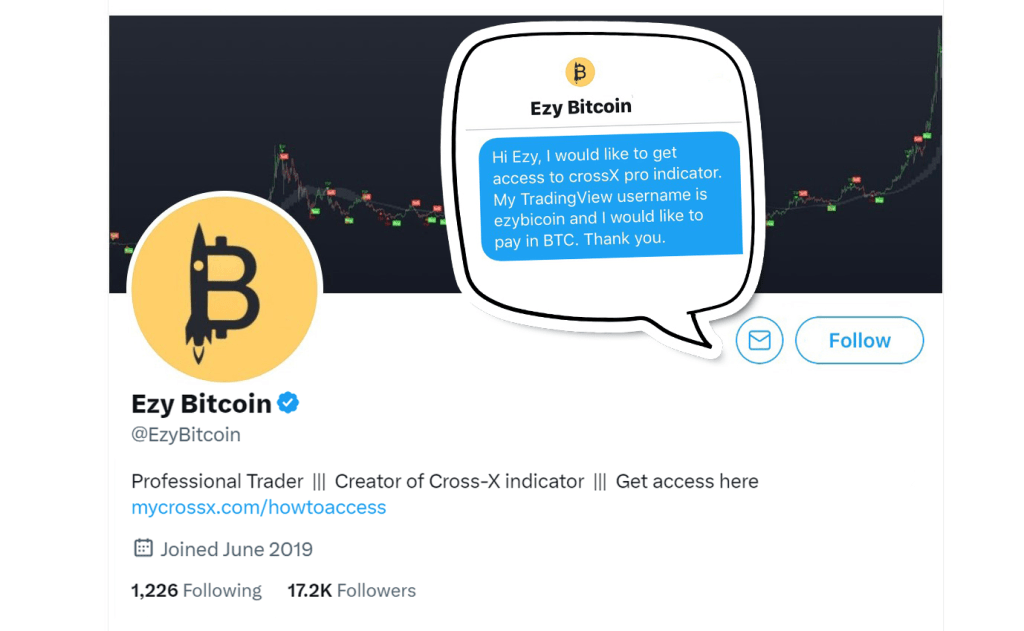 2) Send a direct message to my twitter account “Ezy Bitcoin(@EzyBitcoin)” to request access CrossX Pro indicator and tell us about