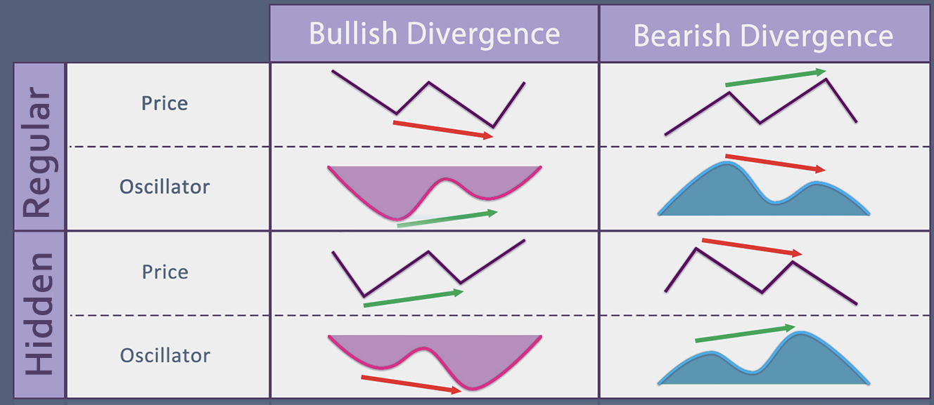 Regular Bullish Divergence (R Bull Div) and Hidden Bullish Divergence (H Bull Div): This situation demonstrates that bears are losing power, and bulls are ready to regain control of the market. Often, a bullish divergence marks the end of a downtrend. It may lead to a consolidation period or a trend reversal.