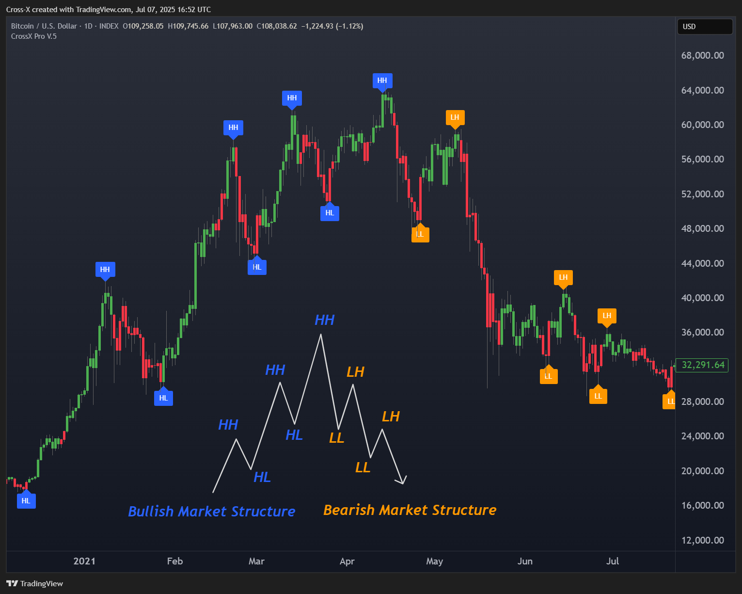 Many traders watch these points closely. If the market price breaks above the previous swing high, the market is considered bullish. Conversely, if the price falls below the previous swing low, the market is bearish. This principle applies across all time frames.
